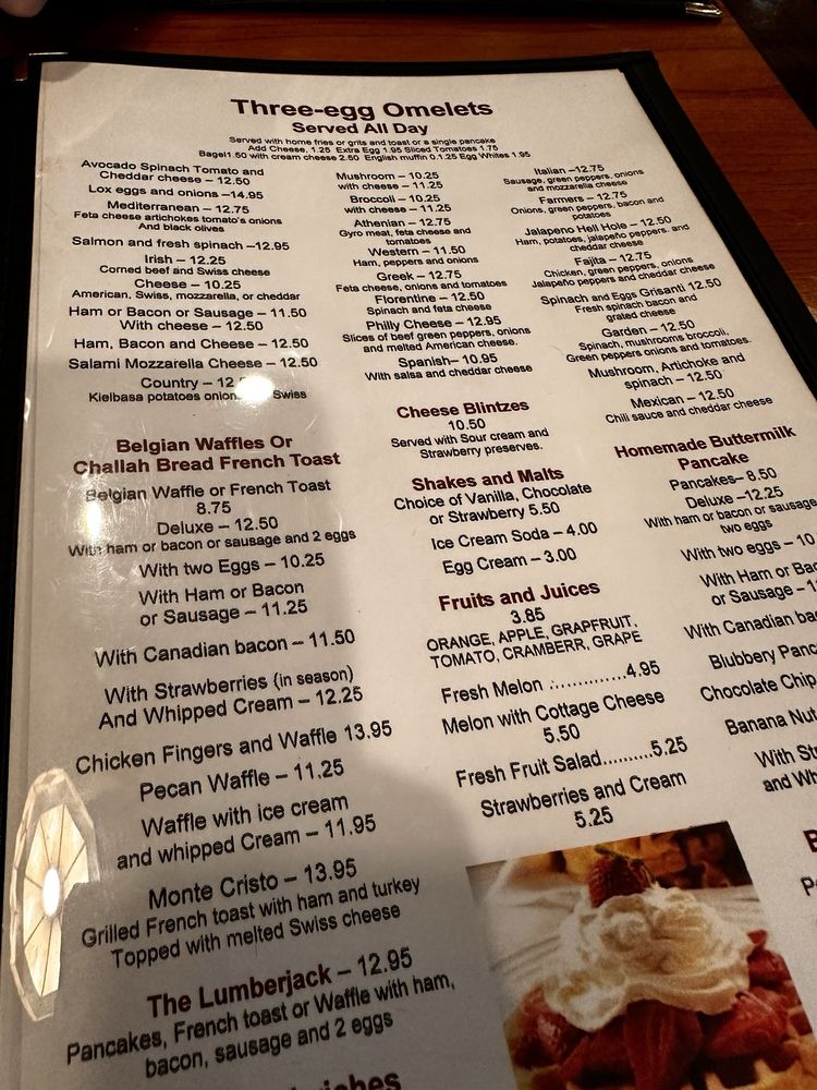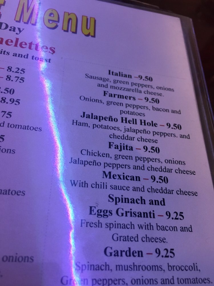 Ham, green peppers and onions. Served with home fries or grits and toast and jelly.